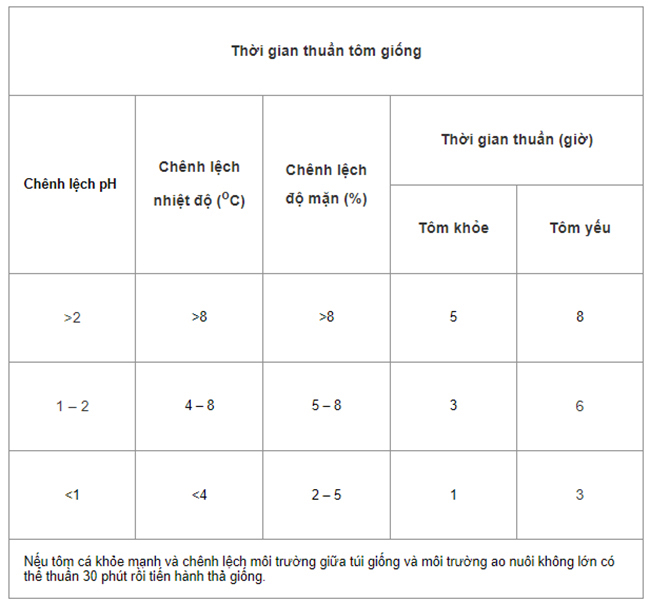 Thời gian thuần tôm giống sẽ phụ thuộc vào sức khỏe của tôm giống, mức độ chênh lệch giữa môi trường túi giống và môi trường ao nuôi, cụ thể được trình bày ở bảng bên dưới.